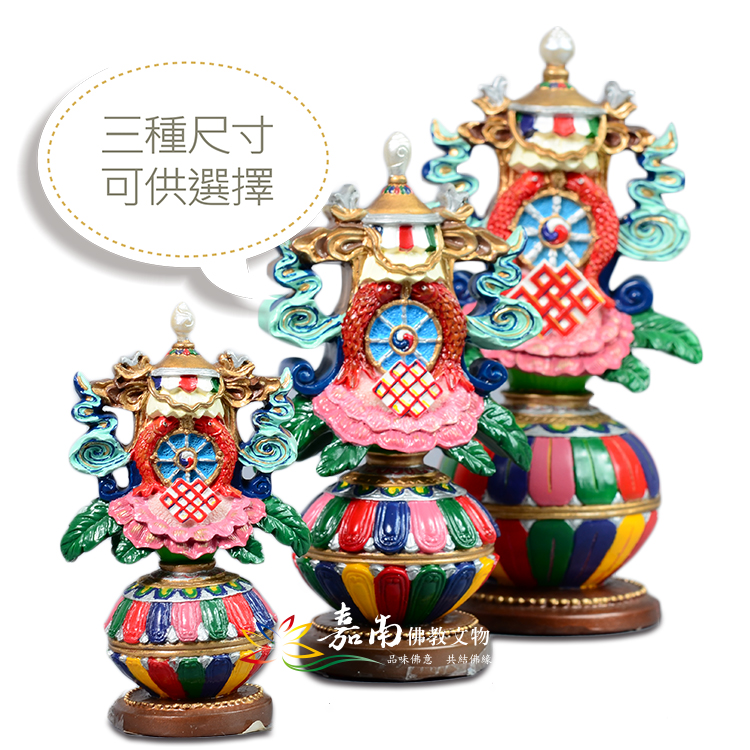 ● 寶瓶-象徵「教法」 寶瓶的形狀像佛的頸子,寶瓶中充滿甘露,代表佛口中不斷的說法利益眾生。 蓮花-象徵「出世間法」 代表佛的舌頭,佛在說法時流利順暢燦爛,宛如金蓮。蓮花也表示神聖純潔,是拒絕汙染的象徵。