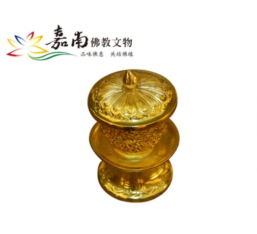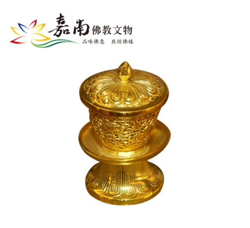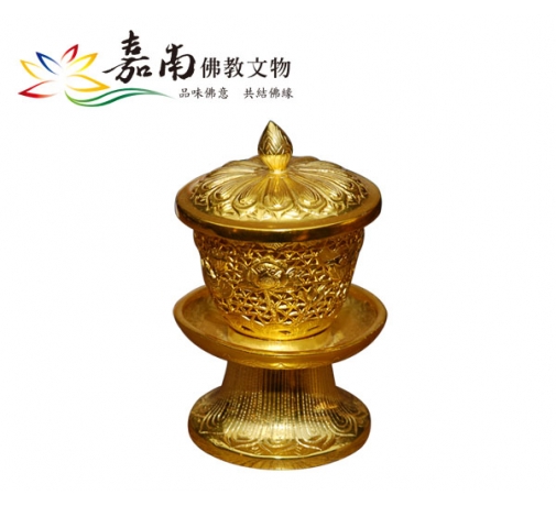 說明 │ 手工雕刻供飯碗,外觀莊嚴,用色飽滿。是以精工細膩的手工方式雕琢而成,杯身以極華麗的簍空方式呈現,杯托上的紋飾也以柔美姿態雕成。可做盛供飯之用。