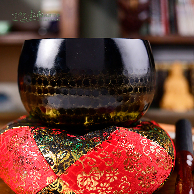 銅罄採用優質銅材料(響銅)精心打制而成,罄的外觀與缽相似,口和底一樣大,中間向外凸出,底部邊緣和口的邊緣都為金色,罄身有黑色、紅色和金色三種,表面上有圖案或者紋路裝飾,罄還配有一根打擊的棒子。