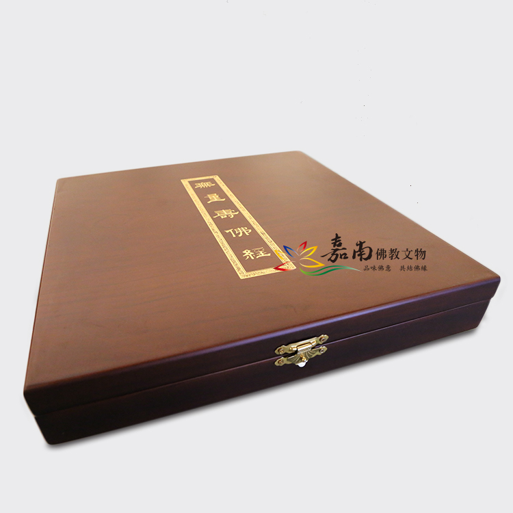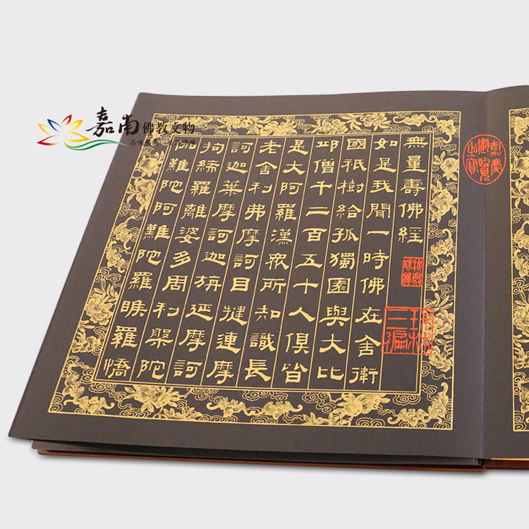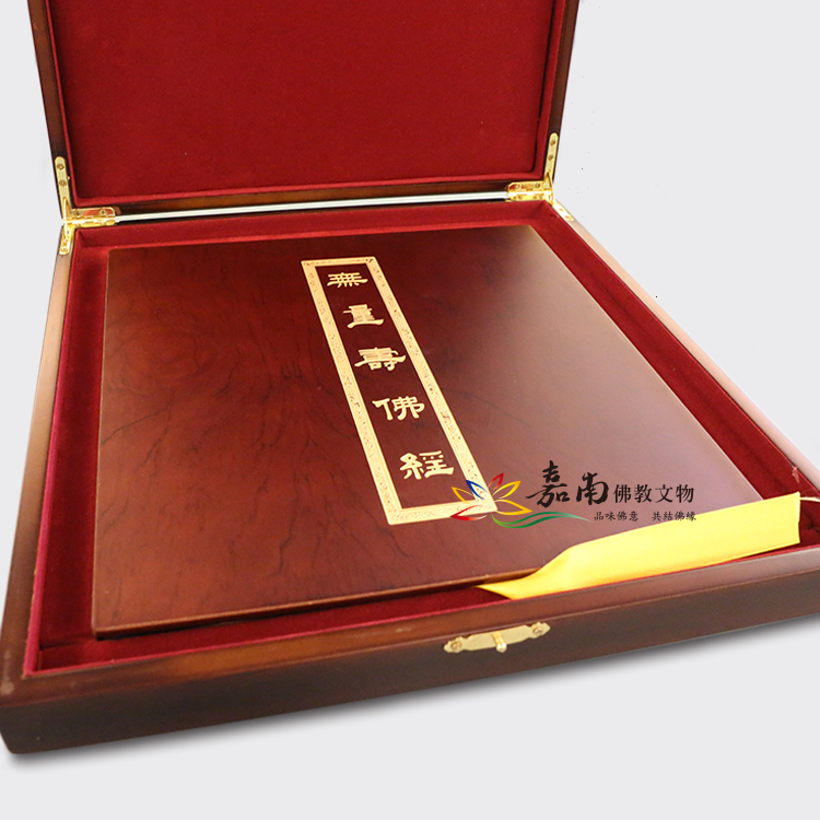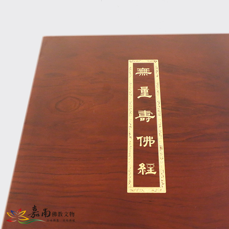 寫經者何故稱本經作「無量壽佛經」是指:原樣典藏經由包覆經本的錦鍛「壽」字索片紋,經中邊匡的蝴蝶、仙桃等吉祥紋樣,以及卷首卷尾分別以慈祥的無量壽佛及十六羅漢雲間來集的畫面,呈現吉祥意味;中國隋唐以前又多稱阿彌陀佛為無量壽佛,故特意將「阿彌陀經」轉稱「無量壽佛經」,因此呈現濃濃的祝壽之意。