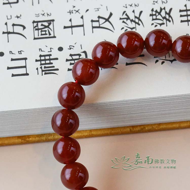 特色 │紅瑪瑙,古稱赤玉,色澤溫潤如火,為佛教七寶之一,自古被視為護身納福之石。此款圓珠晶亮紅潤,手感滑順,象徵調氣安神、圓滿福德,適合日常持念或隨身佩戴,時時提起正念,安住心神。