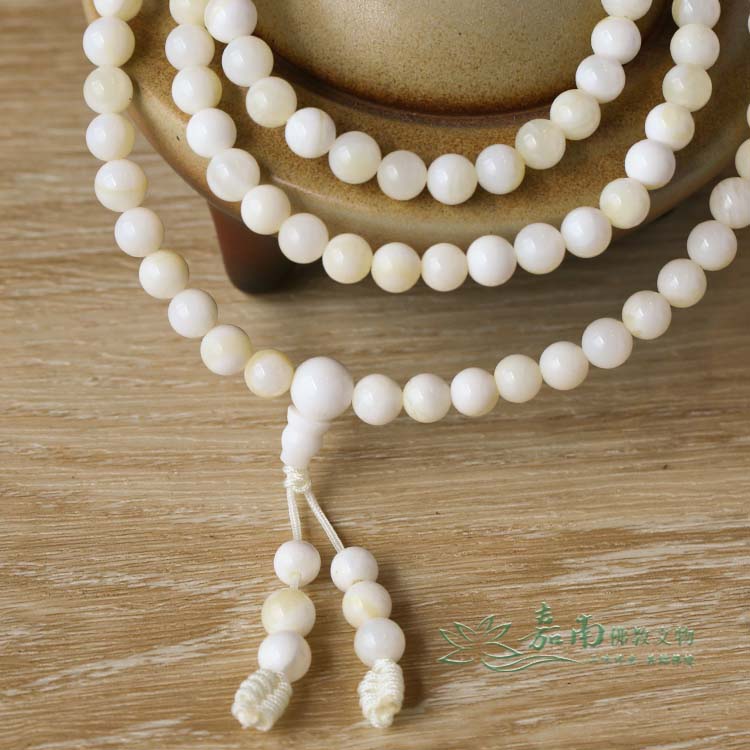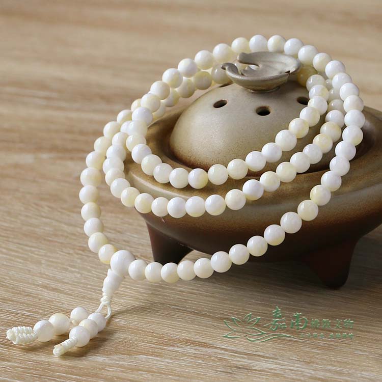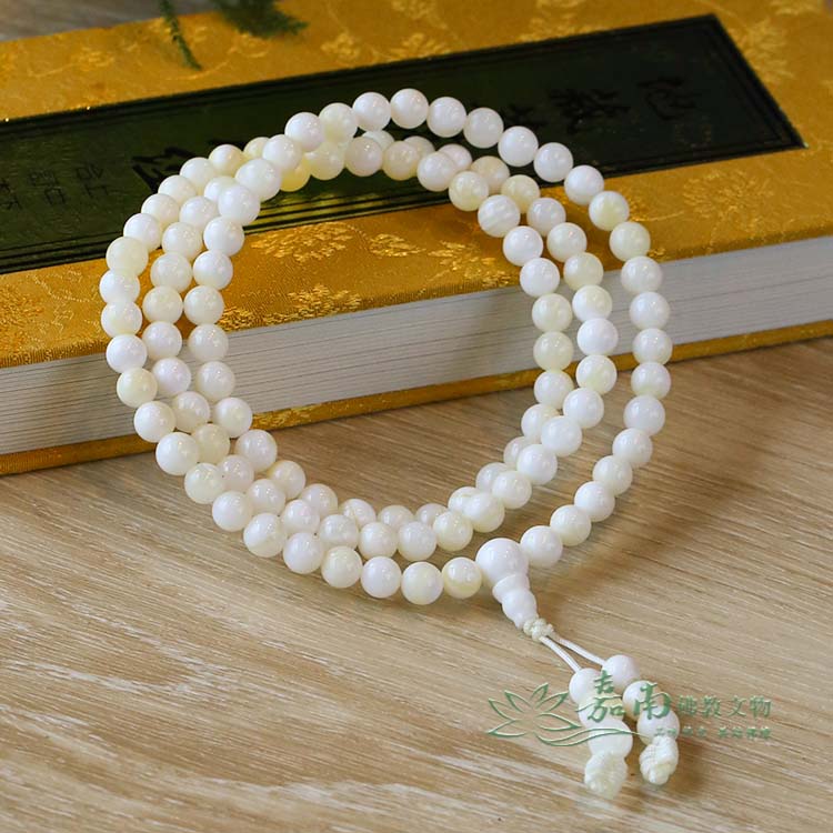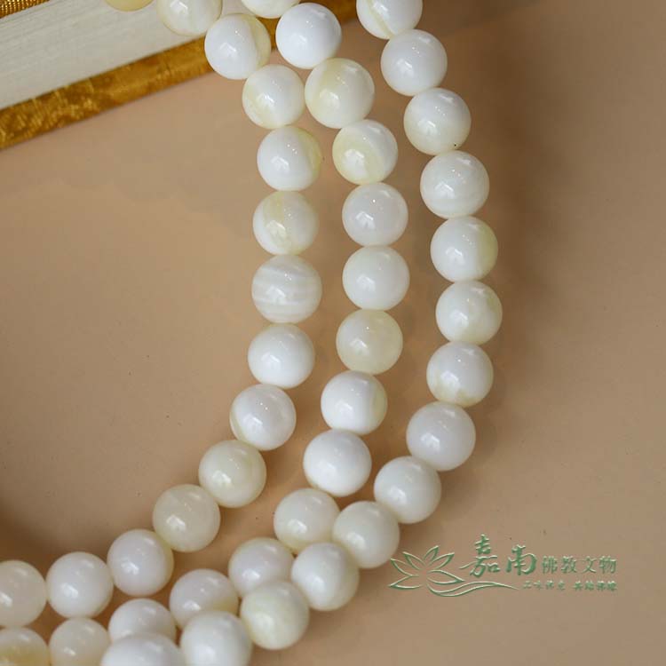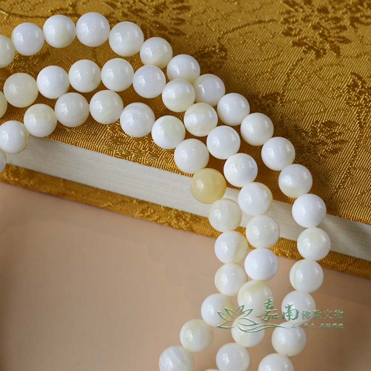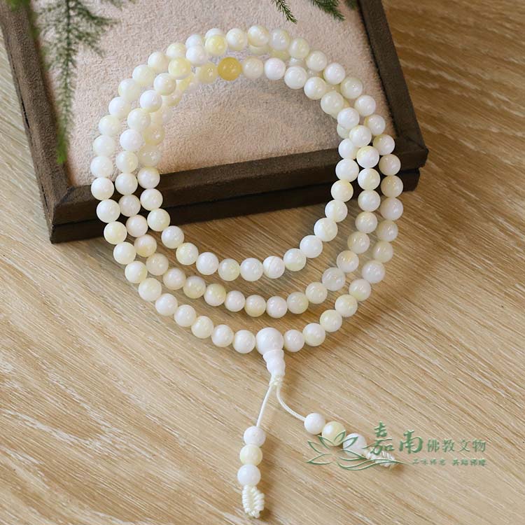 特色 │天然金絲硨磲念珠,108顆設計,佛門七寶之一。潔白珠身內蘊金絲光澤,象徵清淨與智慧,適合持誦、供佛與福慧修行。。