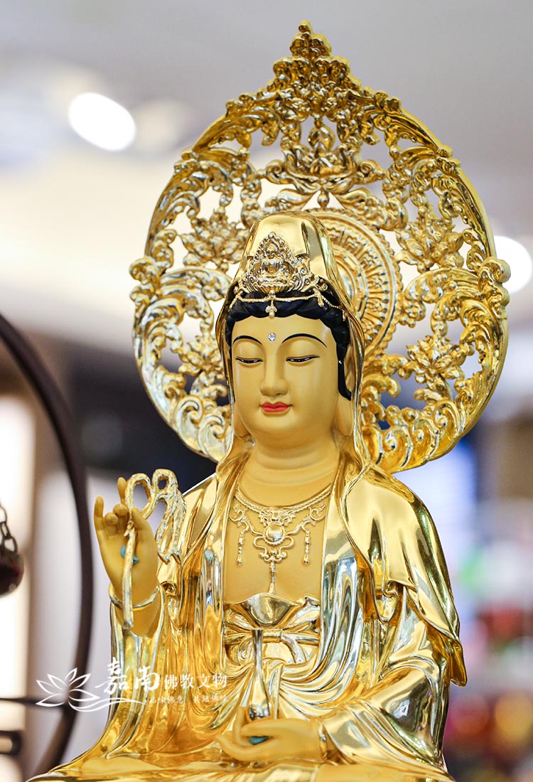 - 寶冠化佛・法相如法| 觀世音菩薩面容圓潤慈和,眉目低垂含笑,象徵「聞聲救苦、隨緣應化」之大悲願力,日日瞻仰,自能令心安住、煩惱漸息。