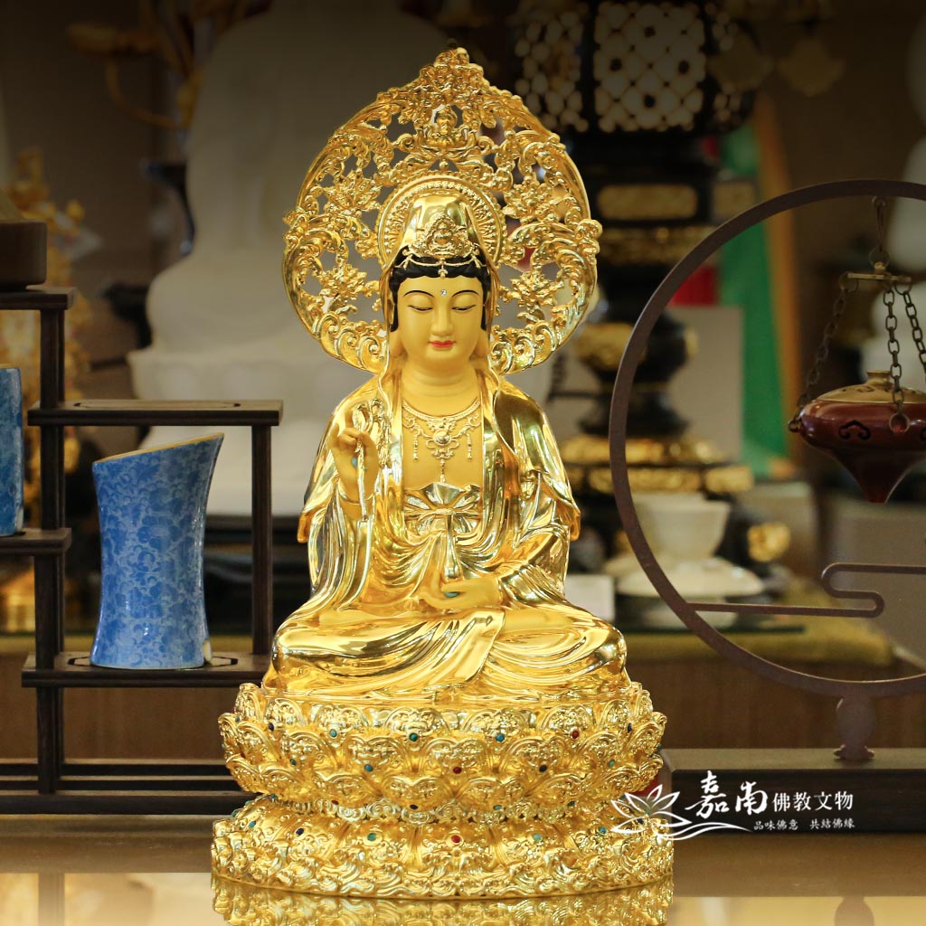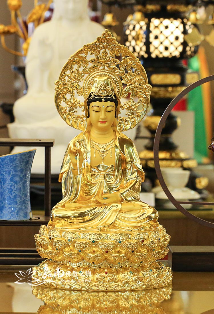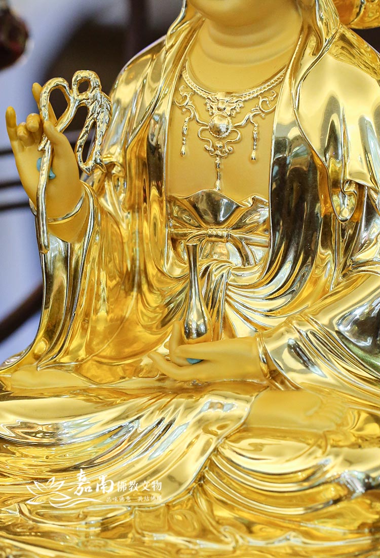 - 手持蓮花・清淨象徵|手持含苞金蓮,象徵出淤泥而不染的佛法清淨,護佑供奉者在紅塵俗世中,常保內心安寧與智慧。