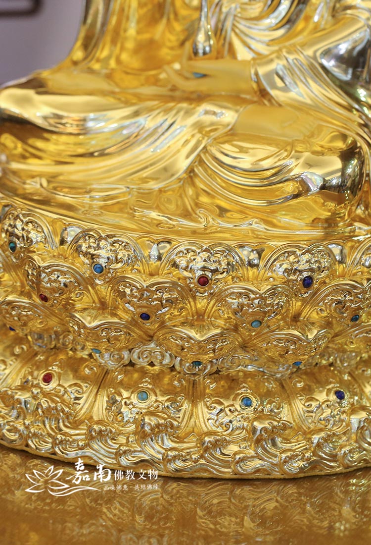 - 蓮座安住・出塵不染|菩薩安坐層層蓮花寶座,蓮瓣立體分明,表法於塵勞世間中,仍能守住清淨智慧與慈悲本心。