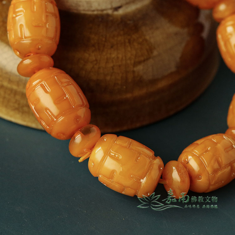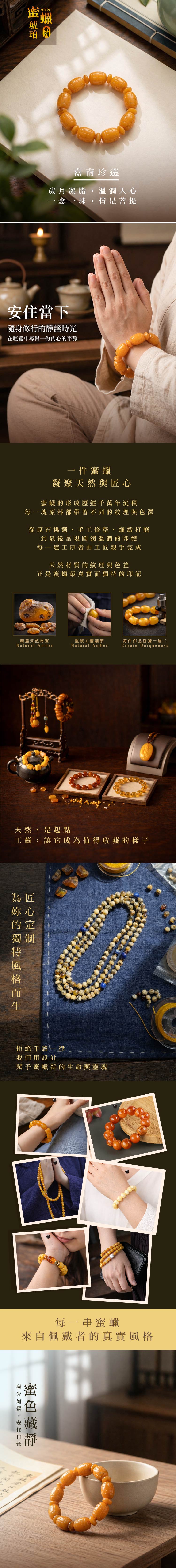 - 穿越千年時空凝結成了深沉、醇厚、晶瑩剔透的琥珀蜜蠟。每一顆琥珀,都有獨特的色彩和紋理,就像是個充滿神秘和美麗的獨立世界 ,這個自然寶藏不僅僅是一種寶石,更是佛教哲學的完美體現,感受著仿佛佛教智者的化身,以琉璃般晶瑩的光芒,傳遞佛教的真理和智慧。