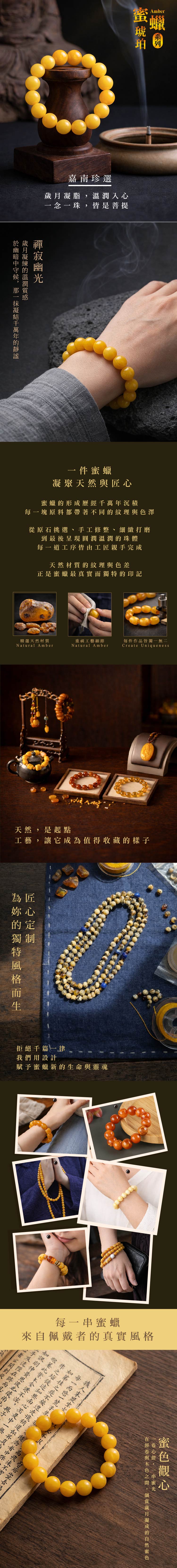 • 穿越千年時空凝結成了深沉、醇厚、晶瑩剔透的琥珀蜜蠟。每一顆琥珀,都有獨特的色彩和紋理,就像是個充滿神秘和美麗的獨立世界 ,這個自然寶藏不僅僅是一種寶石,更是佛教哲學的完美體現,感受著仿佛佛教智者的化身,以琉璃般晶瑩的光芒,傳遞佛教的真理和智慧。