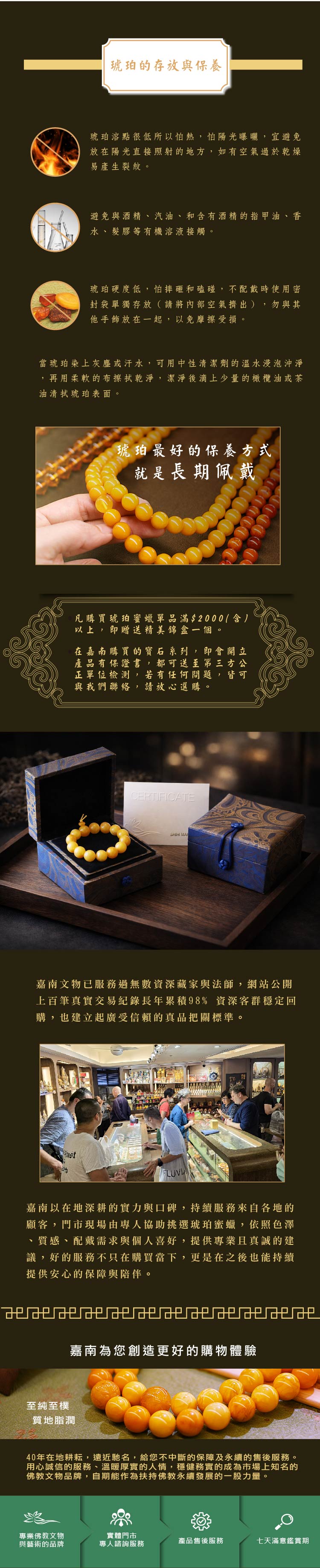 • 嘉南嚴選的高品質琥珀,就像在挑選一個獨特的故事,只有精心挑選和加工的琥珀,才能夠真正展現它的美麗和獨特性。