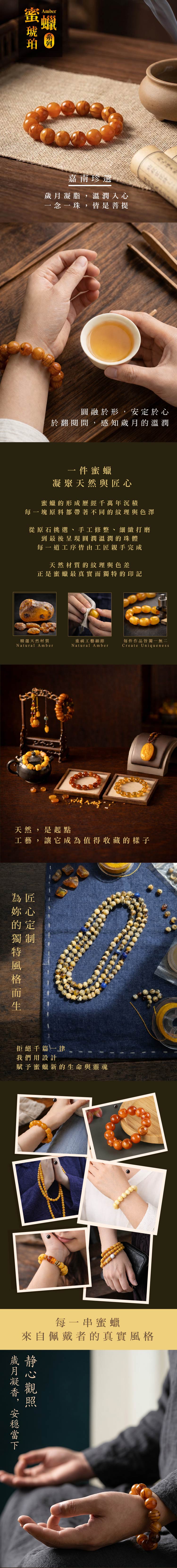 - 穿越千年時空凝結成了深沉、醇厚、晶瑩剔透的琥珀蜜蠟。每一顆琥珀,都有獨特的色彩和紋理,就像是個充滿神秘和美麗的獨立世界 ,這個自然寶藏不僅僅是一種寶石,更是佛教哲學的完美體現,感受著仿佛佛教智者的化身,以琉璃般晶瑩的光芒,傳遞佛教的真理和智慧。