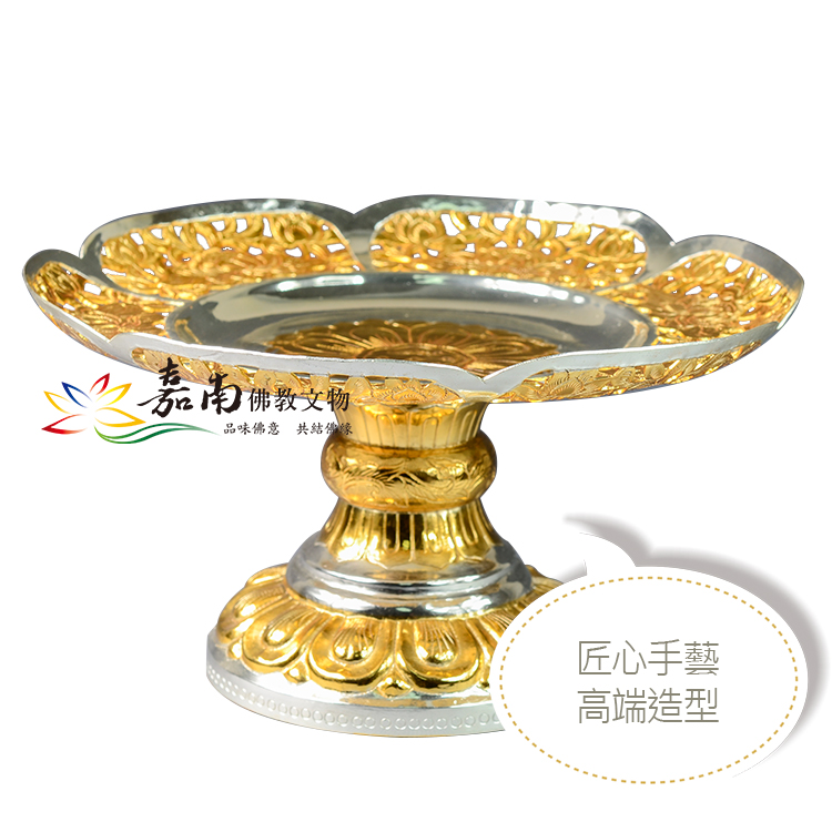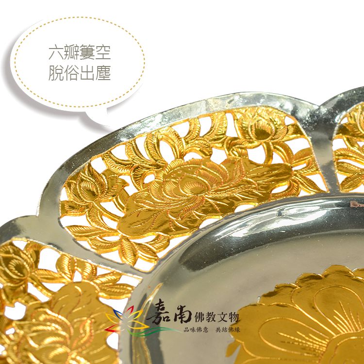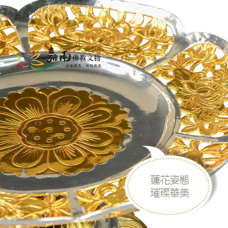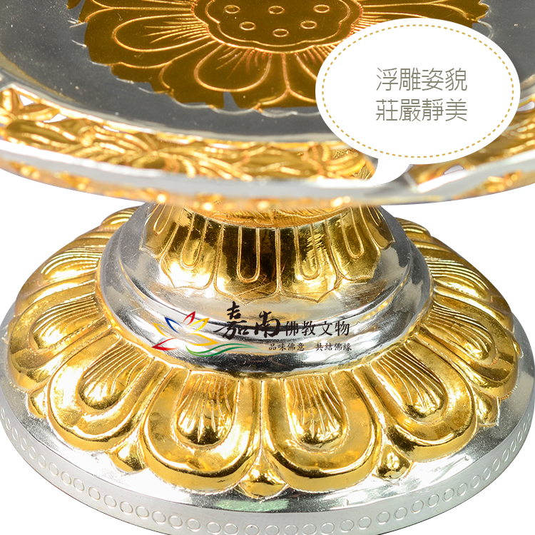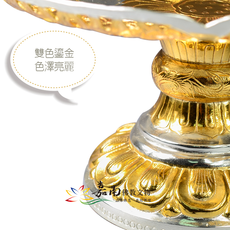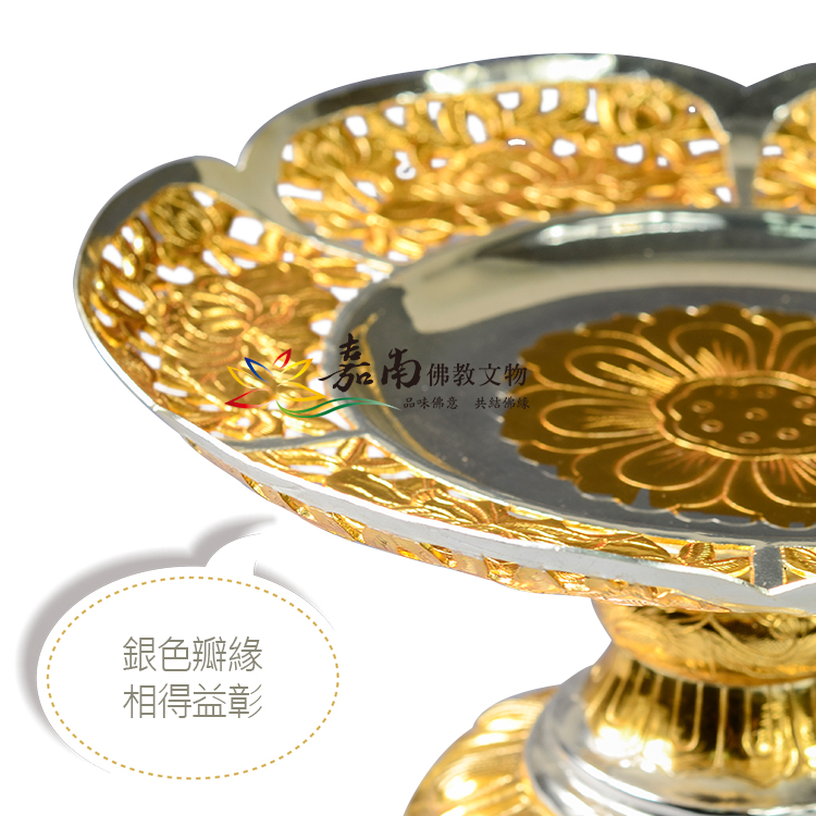 說明 │ 雙色鎏金供果盤以六瓣簍空的蓮花姿態作為供盤的造型,其手工雕成的蓮花樣貌華麗且細膩,六瓣蓮花雕外再以銀邊作為框。供盤中央是以俯看蓮花的姿貌作為浮雕的造型,雕工精美。供盤底座也不馬虎,以蓮花座為造型,搭上色澤亮麗的兩色鎏金,呈現浮雕的精美,造型依舊華麗細緻。