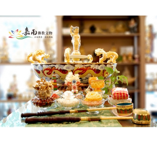 ● 鎏金類的法器與佛像,因外觀有金碧輝煌的效果,使人見了心生歡喜與莊嚴之心。目前以鎏金技術製作製佛俱的手法眾多,舉凡佛像、法器、法像,都可以見到鎏金工法的運用。