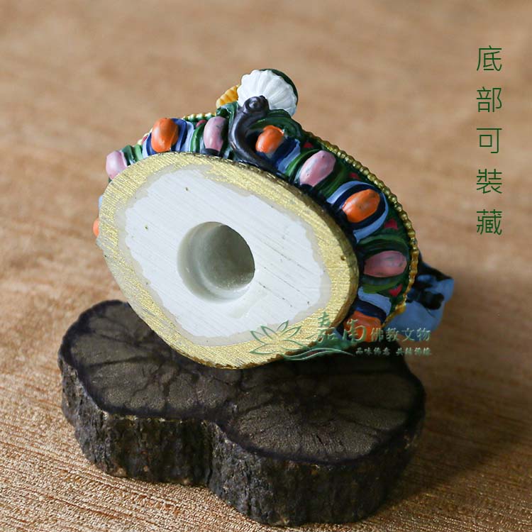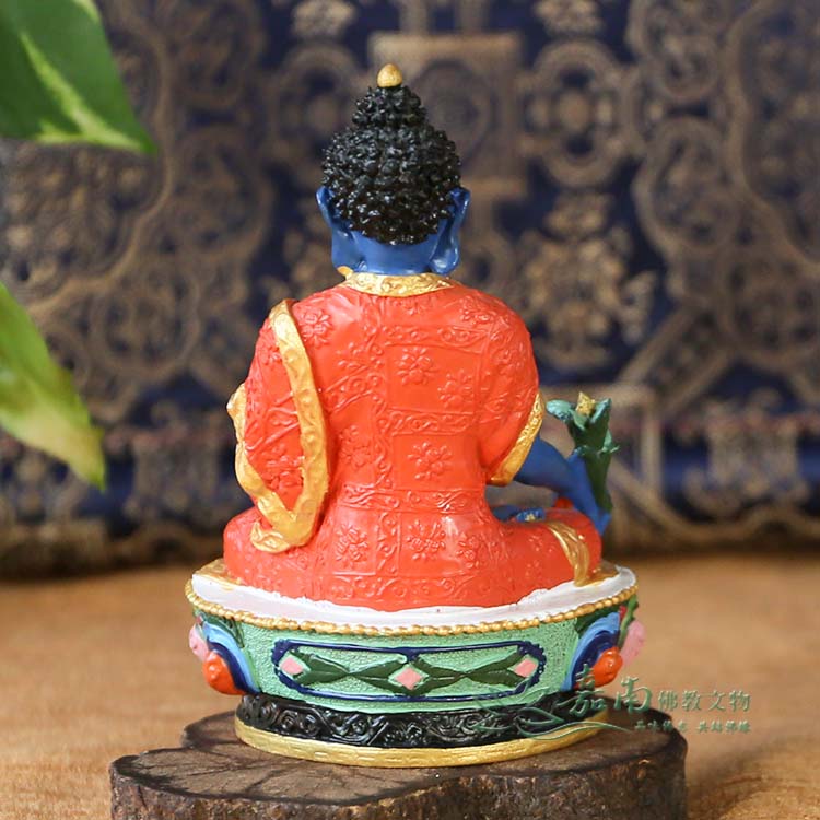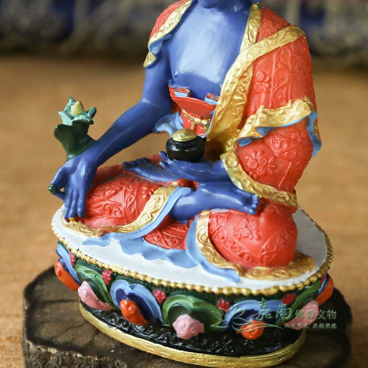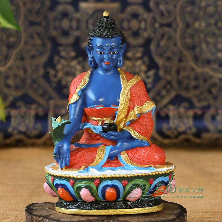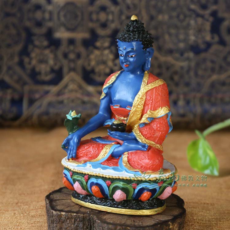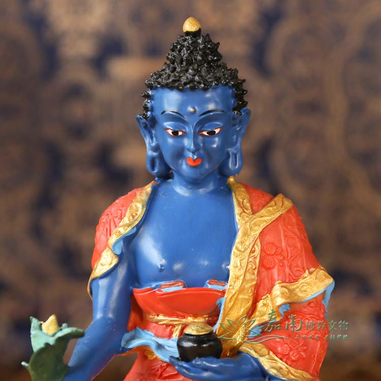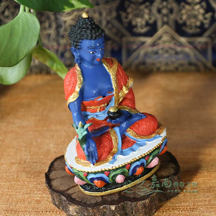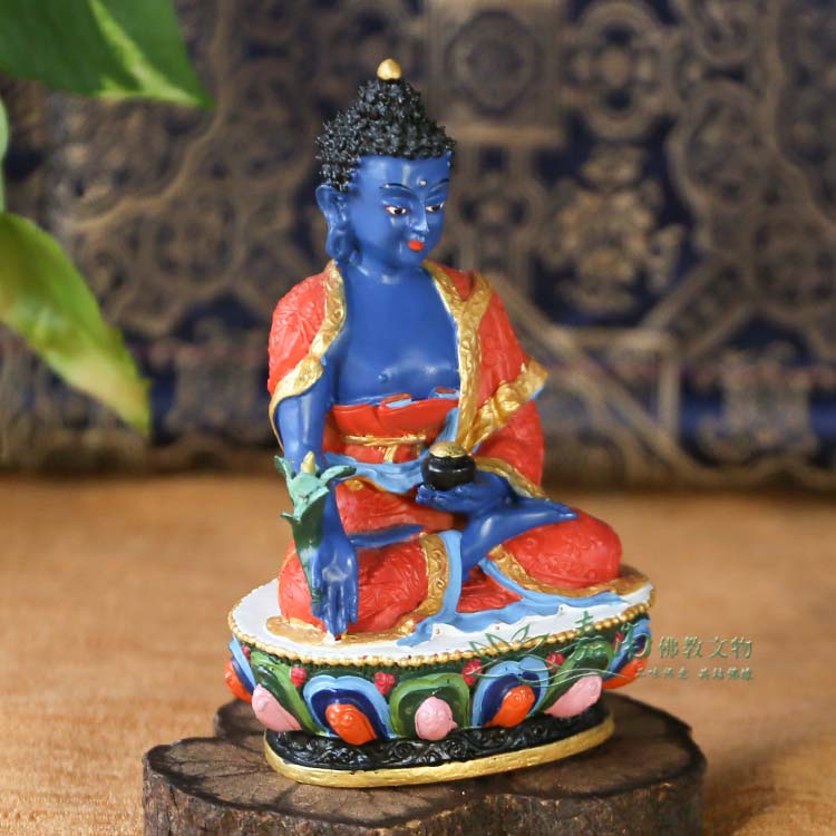 ● 藏傳佛教的藥師佛身藍相好莊嚴,左手持缽盛滿甘露,右手持訶梨勒果(訶子藥)