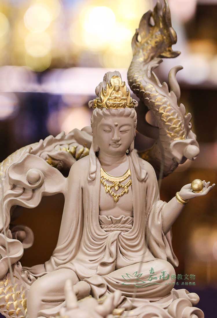 - 威儀法相・安定象徵|觀音神情安詳,騎龍而坐,手持法印或寶瓶,象徵在動盪世間依然保持從容與智慧,護佑家宅平安、事事圓滿。