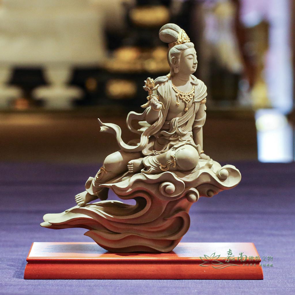 - 遊戲三昧・自在無礙|法相呈現「遊戲觀音」獨有的雲端坐姿,寓意菩薩遊化十方、隨緣救度,展現自在無礙、無拘無束的大智慧。