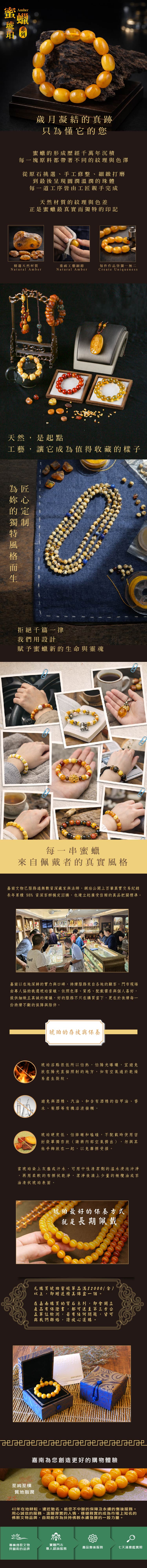 - 穿越千年時空凝結成了深沉、醇厚、晶瑩剔透的琥珀蜜蠟。每一顆琥珀,都有獨特的色彩和紋理,就像是個充滿神秘和美麗的獨立世界 ,這個自然寶藏不僅僅是一種寶石,更是佛教哲學的完美體現,感受著仿佛佛教智者的化身,以琉璃般晶瑩的光芒,傳遞佛教的真理和智慧。
