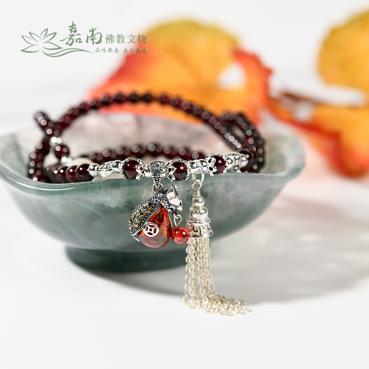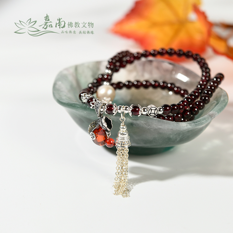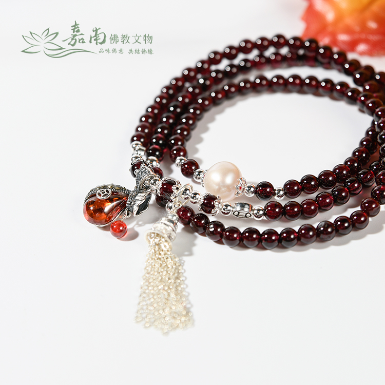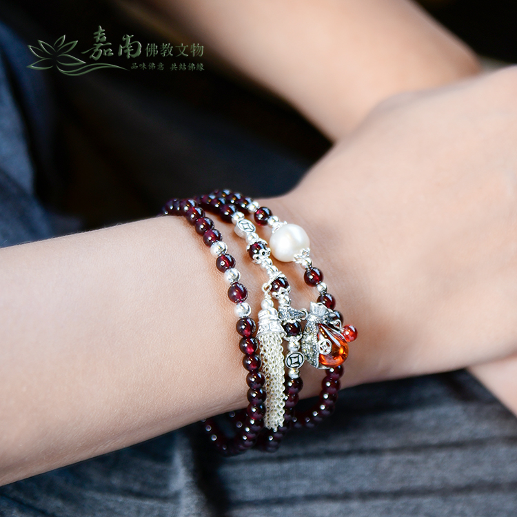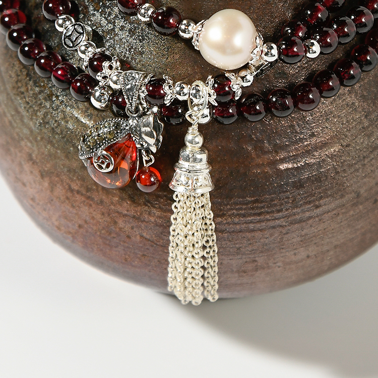 珍珠 鋯石 純銀紅石榴石設計款三圈手串-錢袋款 (4.5mm)