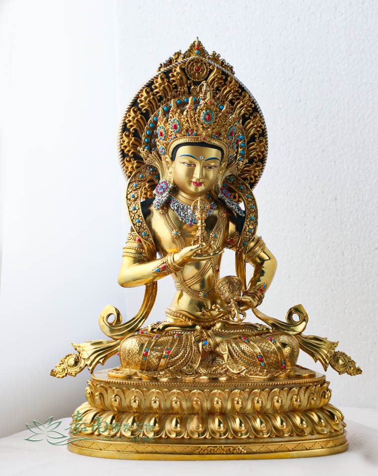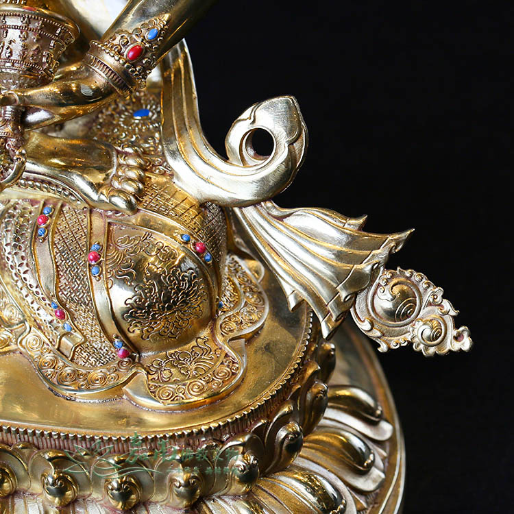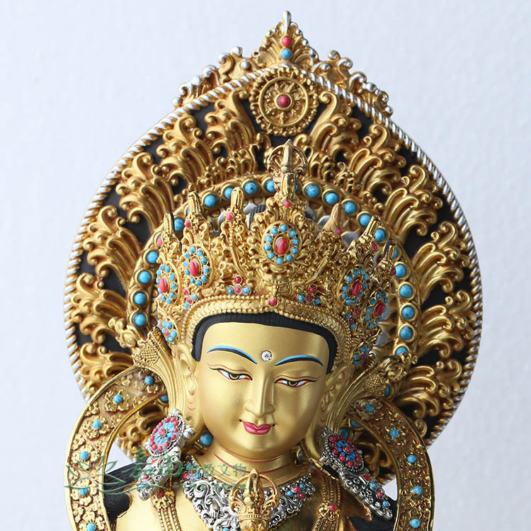 - 色澤獨具特色,光感獨特而精美,彷彿佛法的智慧之光在其中閃耀。這不僅是外觀的美感,更象徵著光明與智慧的結合。精湛的雕刻工藝赋予了佛像細緻而豐富的層次,搭配著藏式風格的吉祥雕刻,使整體造型繁複而不雜,象徵著佛法的教義,每一處的雕刻都深植於佛理的思想,彰顯了密宗佛法的智慧與慈悲。