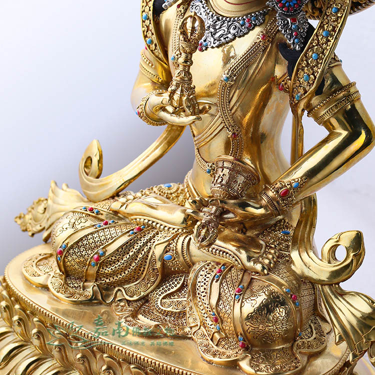 - 精雕鎏金密宗佛像取材厚重精銅鑄造佛身,衣袖上的花紋優雅,裙襬折疊流暢,鑲寶的點綴使其更加華麗尊貴,散發著濃厚的佛典氛圍,手感厚實的黃銅質地,不僅帶給您觸覺上的舒適感,更如同心靈的輕觸,揭示了密宗佛理的深奧