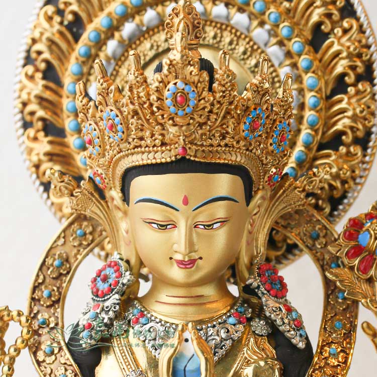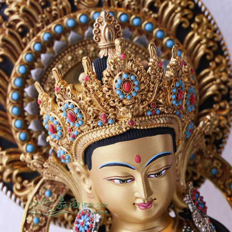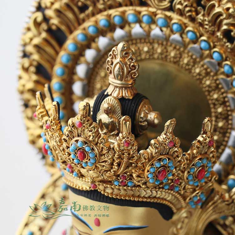 - 色澤獨具特色,光感獨特而精美,彷彿佛法的智慧之光在其中閃耀。這不僅是外觀的美感,更象徵著光明與智慧的結合。精湛的雕刻工藝赋予了佛像細緻而豐富的層次,搭配著藏式風格的吉祥雕刻,使整體造型繁複而不雜,象徵著佛法的教義,每一處的雕刻都深植於佛理的思想,彰顯了密宗佛法的智慧與慈悲。