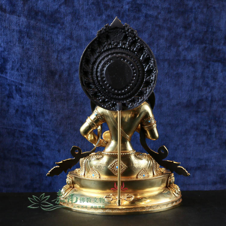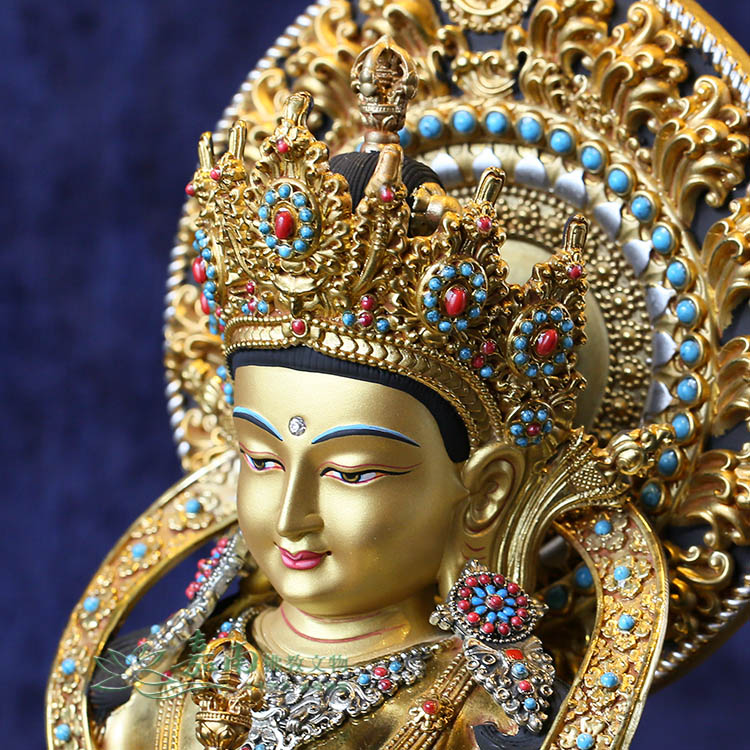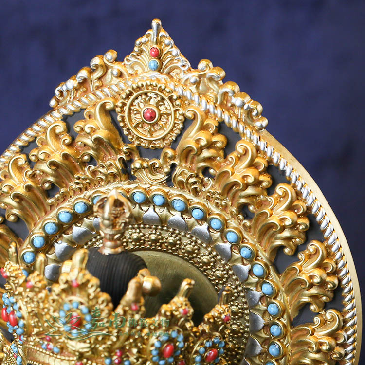 - 色澤獨具特色,光感獨特而精美,彷彿佛法的智慧之光在其中閃耀。這不僅是外觀的美感,更象徵著光明與智慧的結合。精湛的雕刻工藝赋予了佛像細緻而豐富的層次,搭配著藏式風格的吉祥雕刻,使整體造型繁複而不雜,象徵著佛法的教義,每一處的雕刻都深植於佛理的思想,彰顯了密宗佛法的智慧與慈悲。