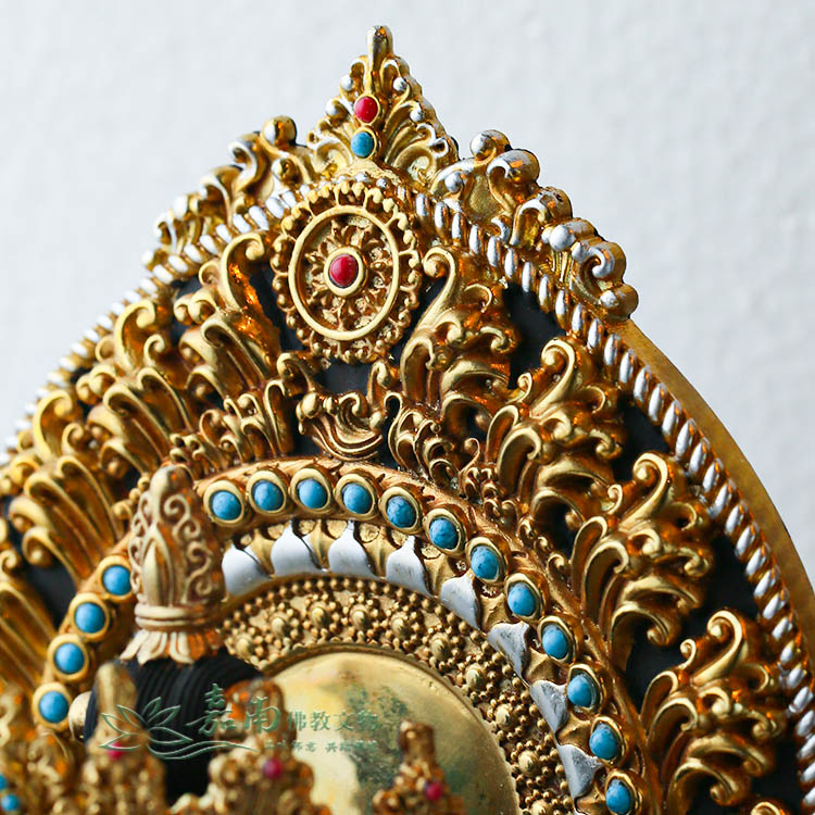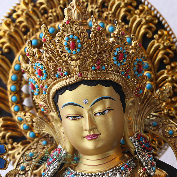 - 色澤獨具特色,光感獨特而精美,彷彿佛法的智慧之光在其中閃耀。這不僅是外觀的美感,更象徵著光明與智慧的結合。精湛的雕刻工藝赋予了佛像細緻而豐富的層次,搭配著藏式風格的吉祥雕刻,使整體造型繁複而不雜,象徵著佛法的教義,每一處的雕刻都深植於佛理的思想,彰顯了密宗佛法的智慧與慈悲。