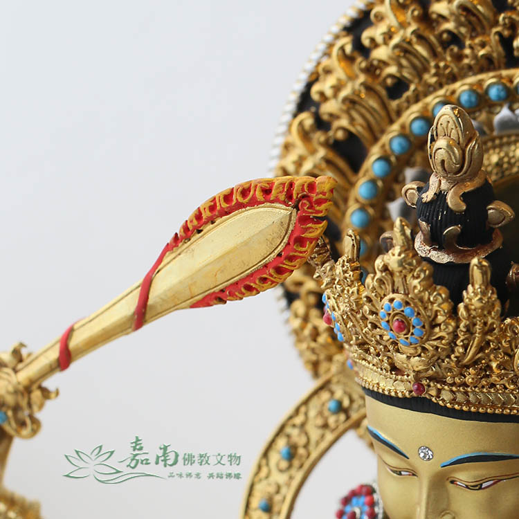 - 色澤獨具特色,光感獨特而精美,彷彿佛法的智慧之光在其中閃耀。這不僅是外觀的美感,更象徵著光明與智慧的結合。精湛的雕刻工藝赋予了佛像細緻而豐富的層次,搭配著藏式風格的吉祥雕刻,使整體造型繁複而不雜,象徵著佛法的教義,每一處的雕刻都深植於佛理的思想,彰顯了密宗佛法的智慧與慈悲。