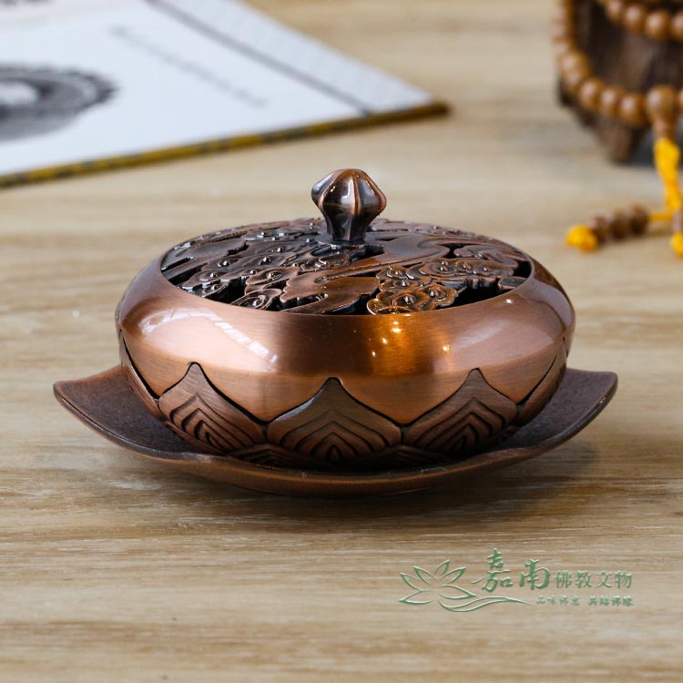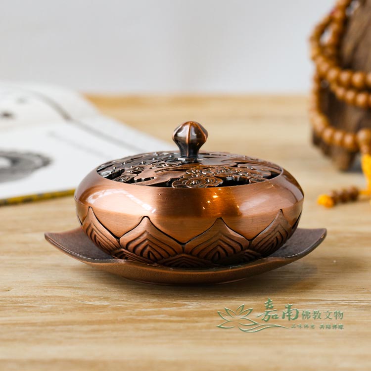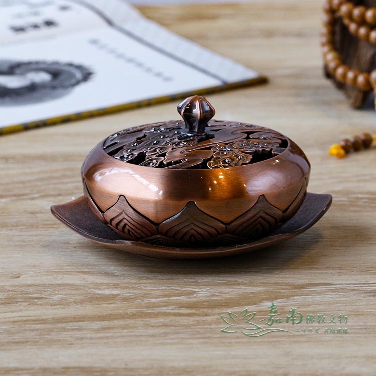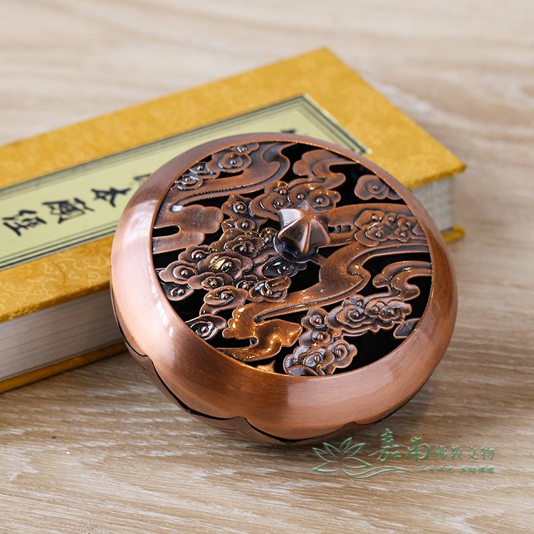 - 仿紅古銅韻|鏤空花蓋 呈現沈穩的復古銅金色澤。爐蓋佈滿精細的鏤空雲紋,繁而不亂。燃香時,青煙自鏤空處緩緩溢出,如雲霧繚繞,極具觀賞性。