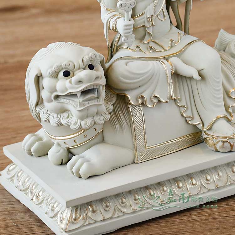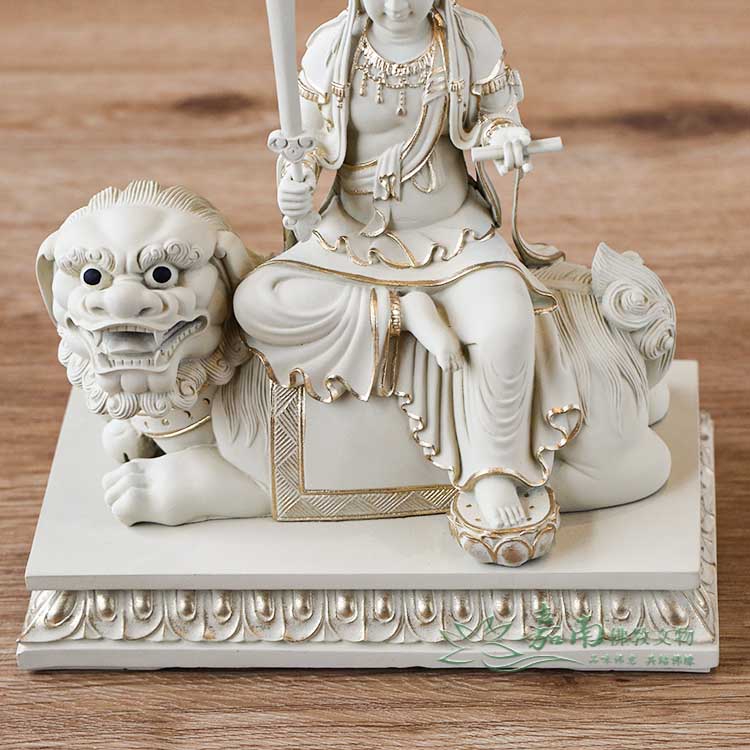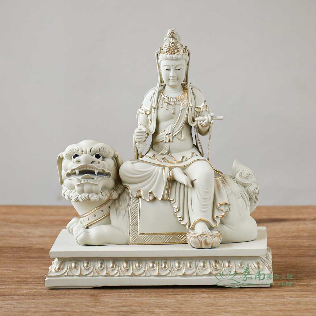 金色點綴恰到好處,在低調中展現尊貴,呈現修行者所重視的內斂、穩定與清明。 - 騎獅法相・降伏煩惱|手持智慧法器,騎乘青獅,象徵以般若智慧照破迷惘、安定心念,展現「智慧中帶威德」的殊勝法相。