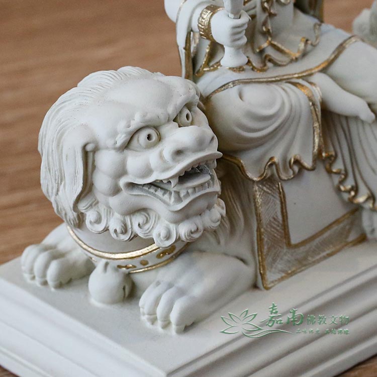 金色點綴恰到好處,在低調中展現尊貴,呈現修行者所重視的內斂、穩定與清明。 - 騎獅法相・降伏煩惱|手持智慧法器,騎乘青獅,象徵以般若智慧照破迷惘、安定心念,展現「智慧中帶威德」的殊勝法相。